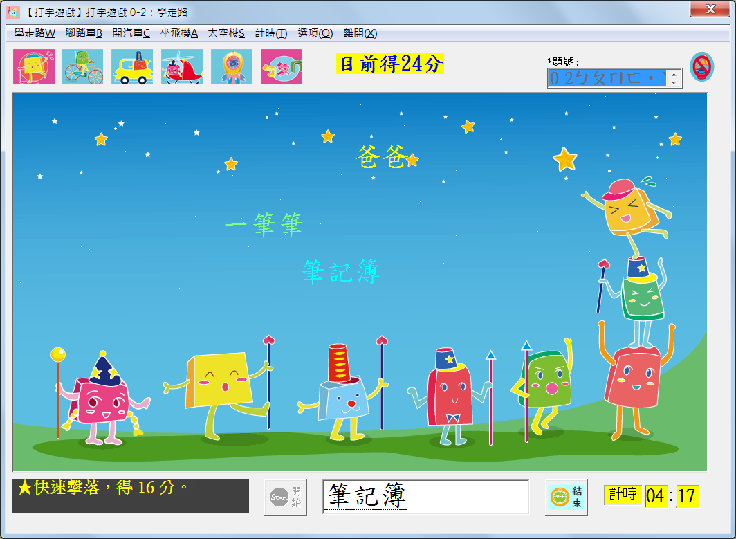 《計時測驗》 ![]() ⊙ 配合小朋友和指法學習,編寫範例,活潑有趣。 ⊙ 融入字音字形學習,可以避免打錯字。 |